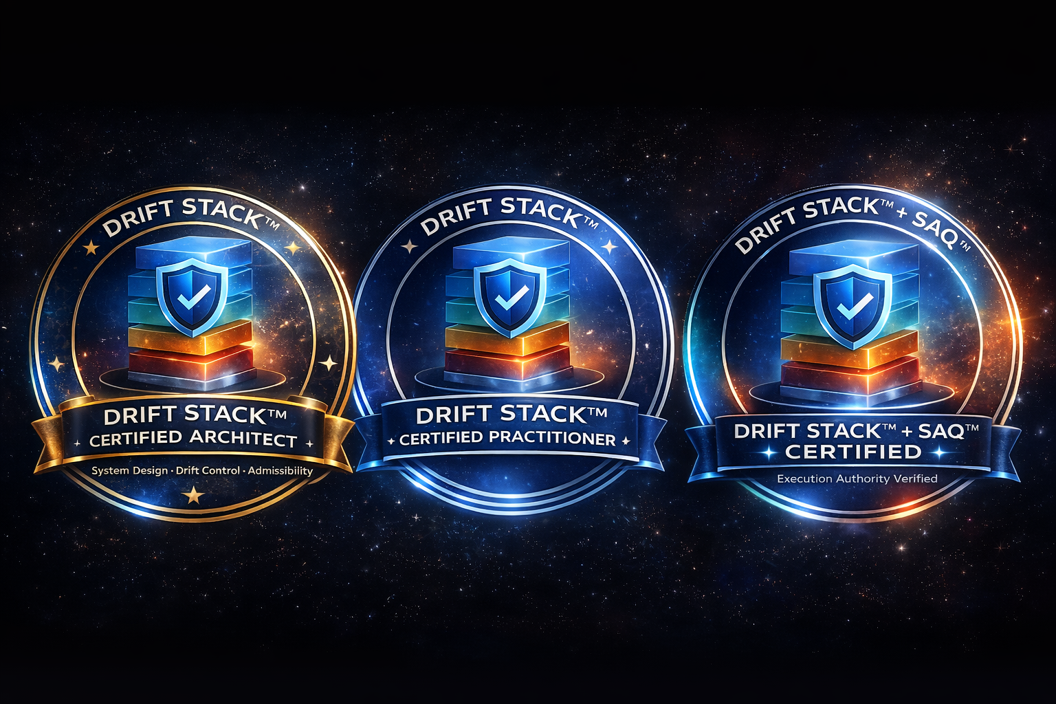Drift Stack™ + SAQ™ Certified indicates architecture plus admissibility-layer enforcement.